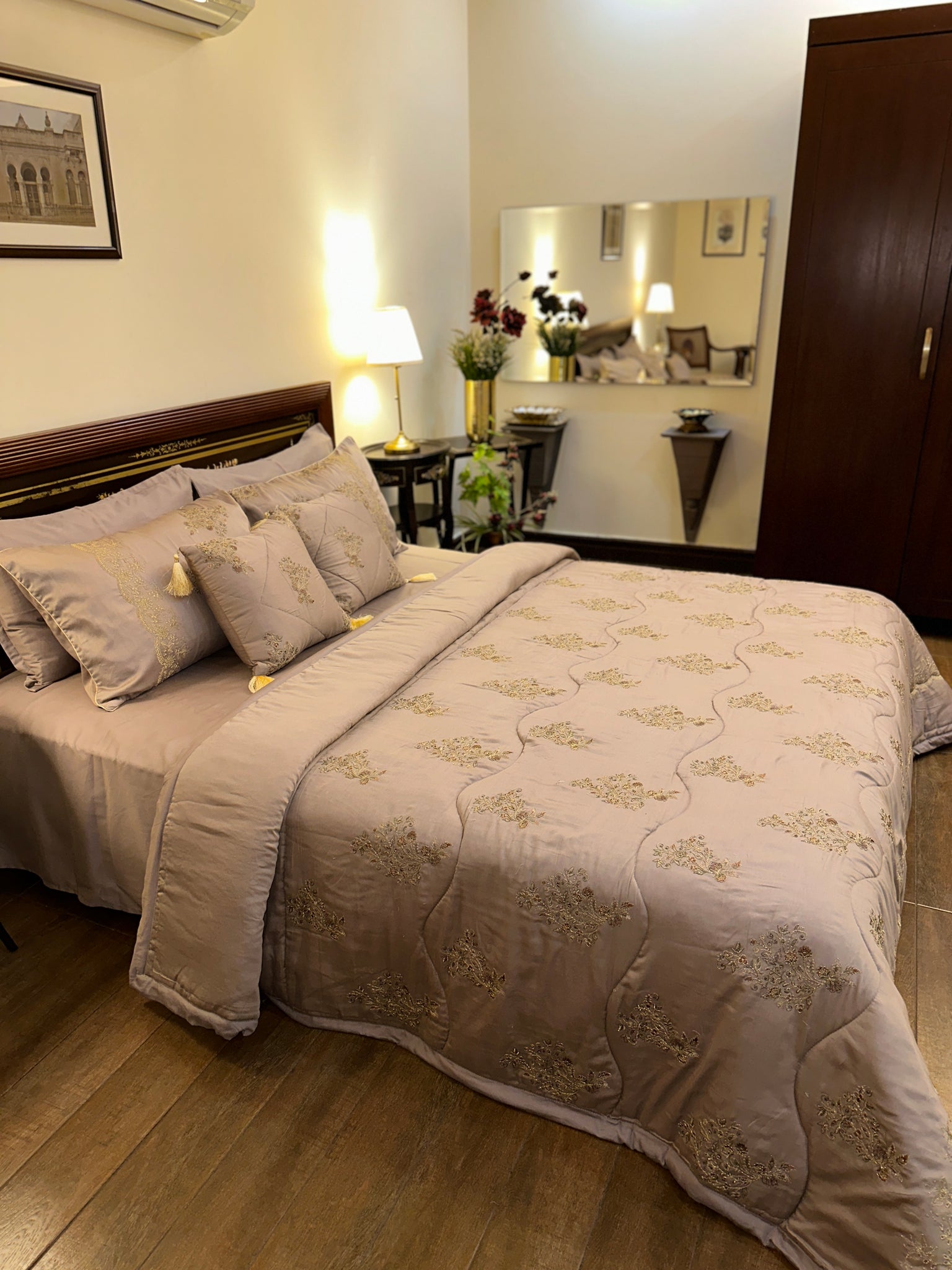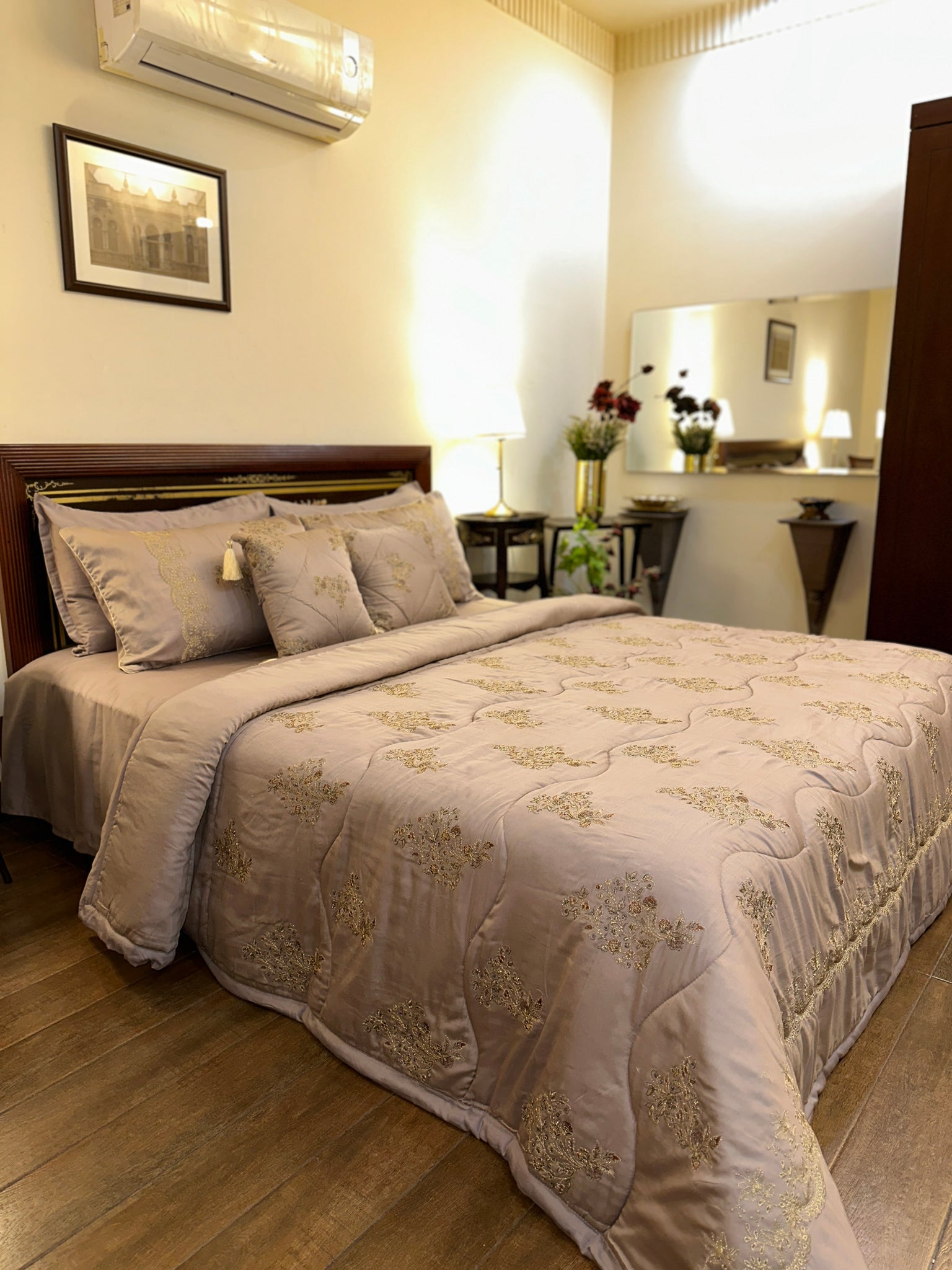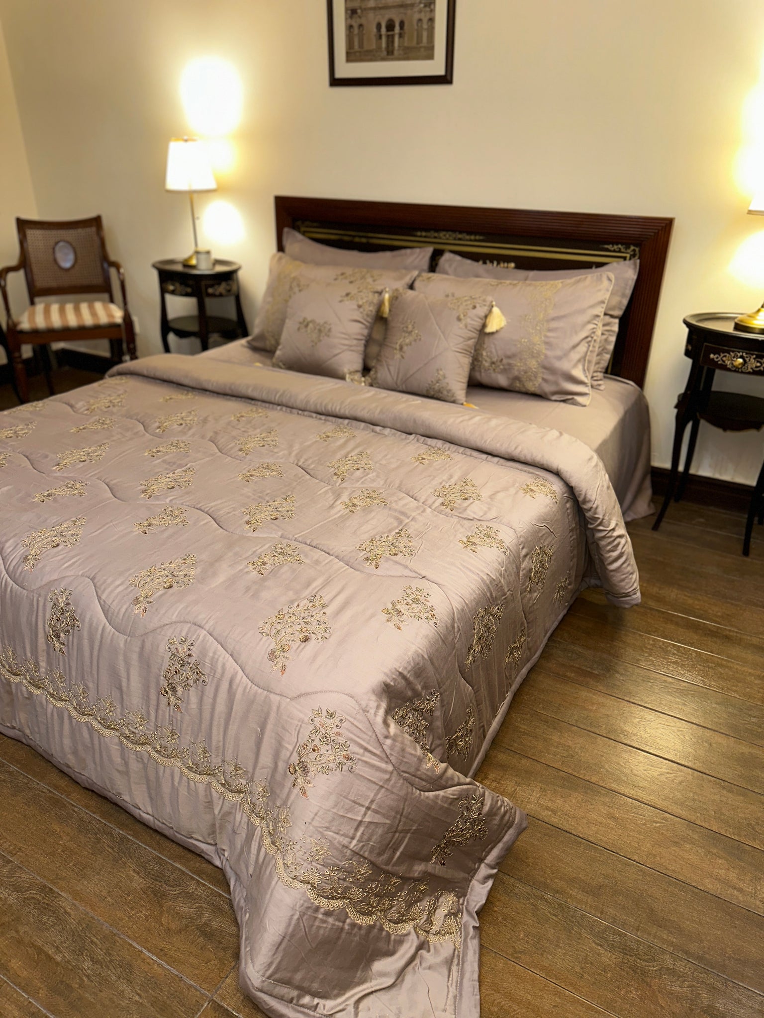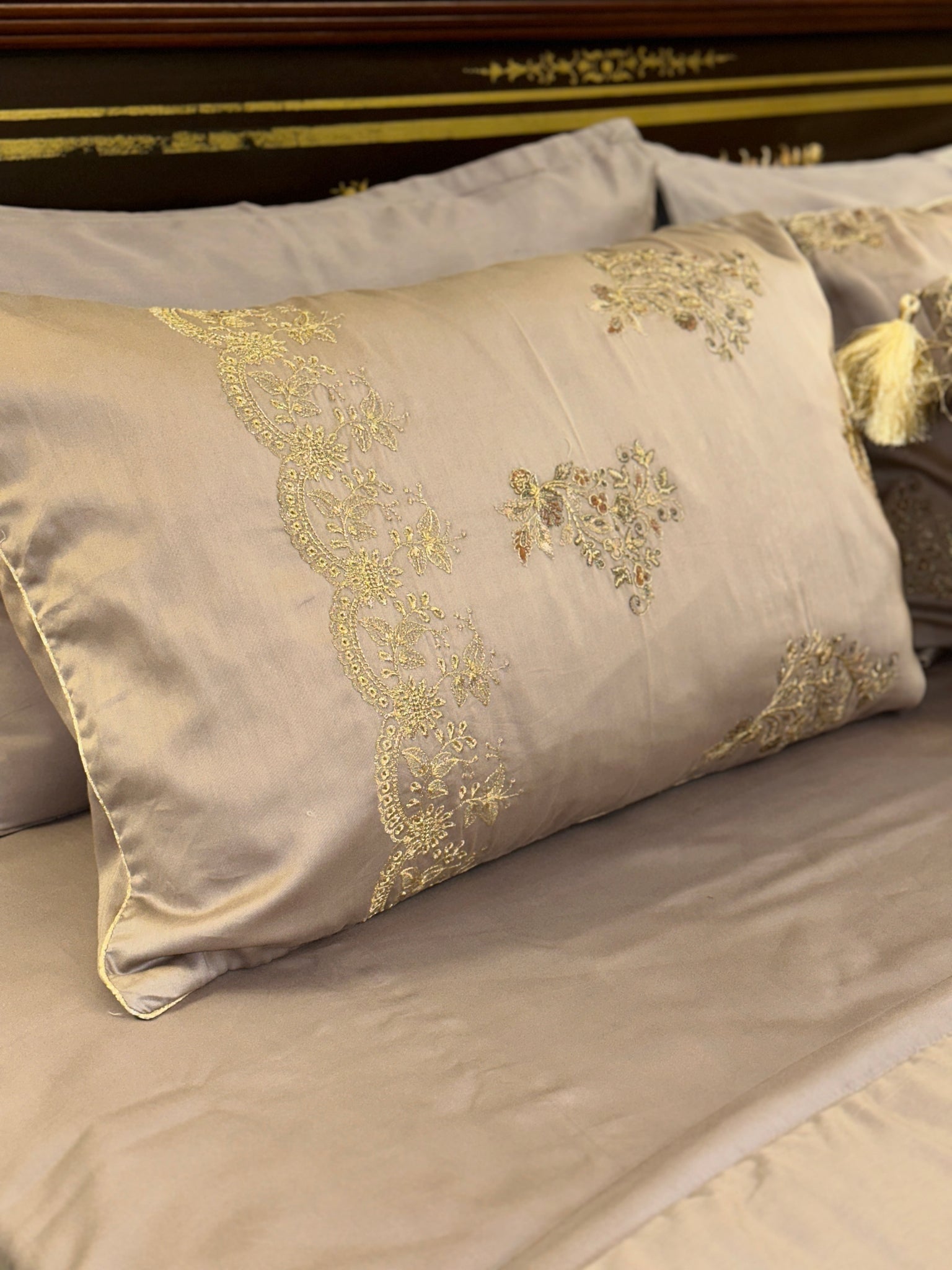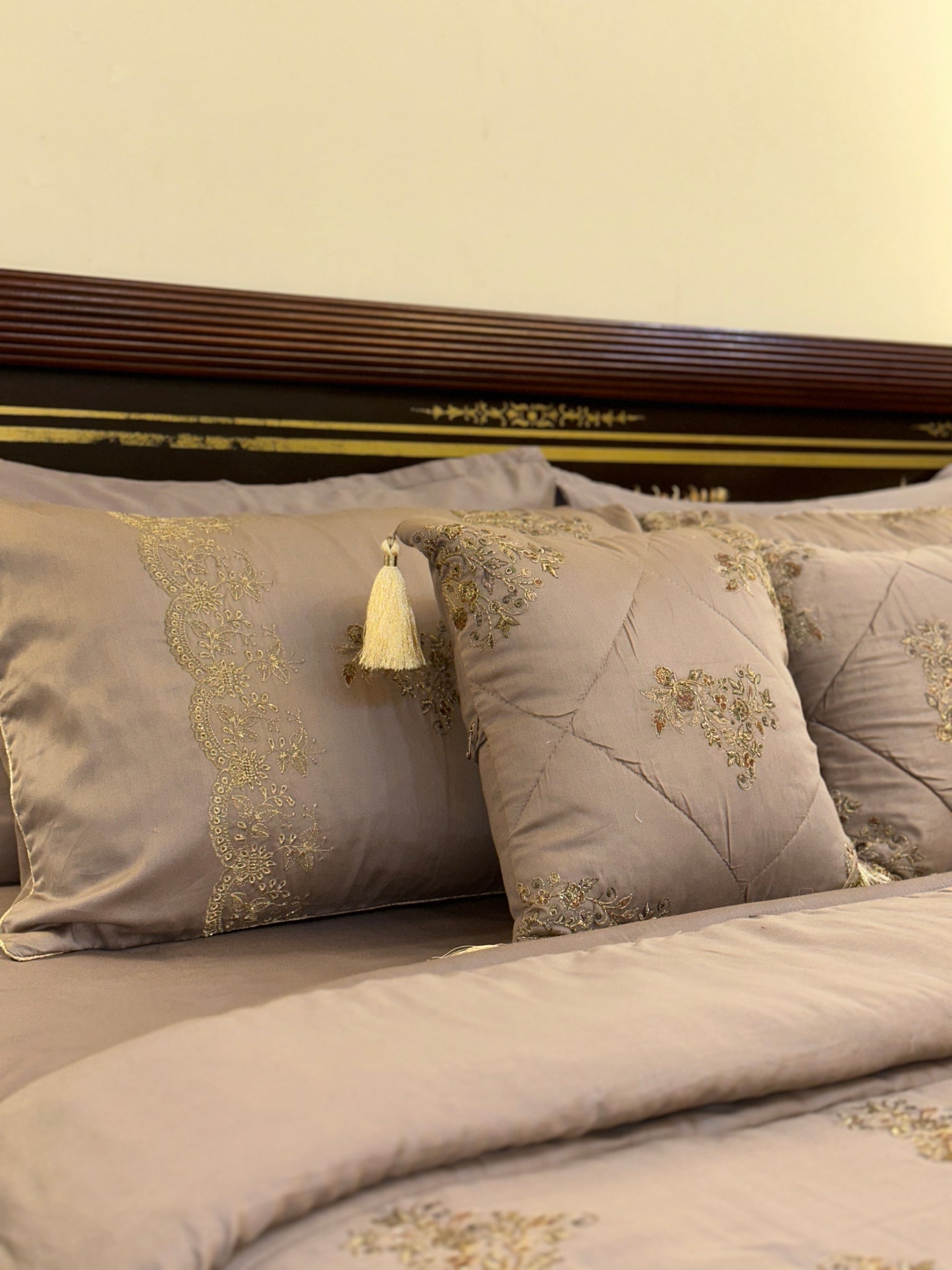 Earthy, warm, and timeless — Mahal e-Reet channels heritage elegance in premium cotton satin finished with tilla and sequence embroidery work. This 8-piece set is perfect for homes that favour understated royalty over loud colour — a versatile premium bridal staple.