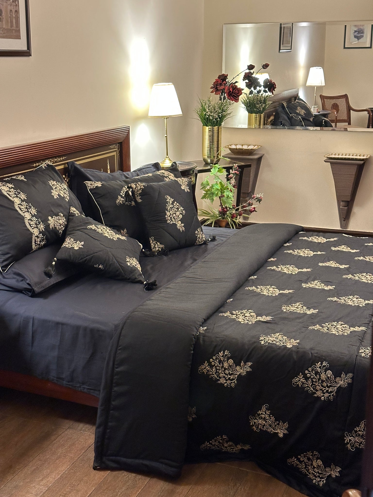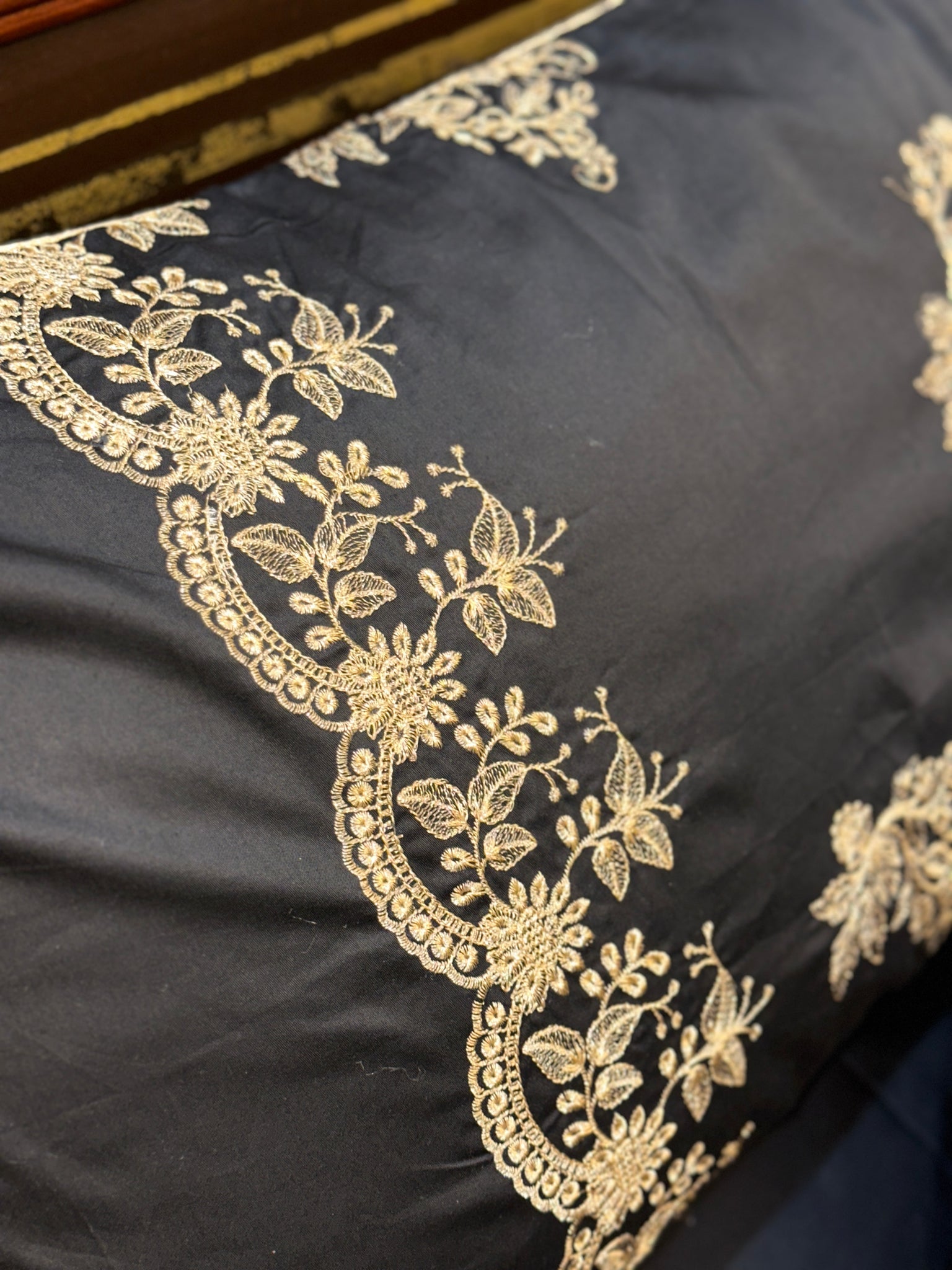 A statement of regal elegance, Siyah e-Zewar is crafted in premium cotton satin paired with tilla and sequence embroidery work in an opulent gold palette. Perfect for brides who prefer a bold, heirloom-inspired bed set that mirrors the grandeur of wedding festivities. An 8-piece complete bridal bed sheet set designed to elevate the room with royal charm.