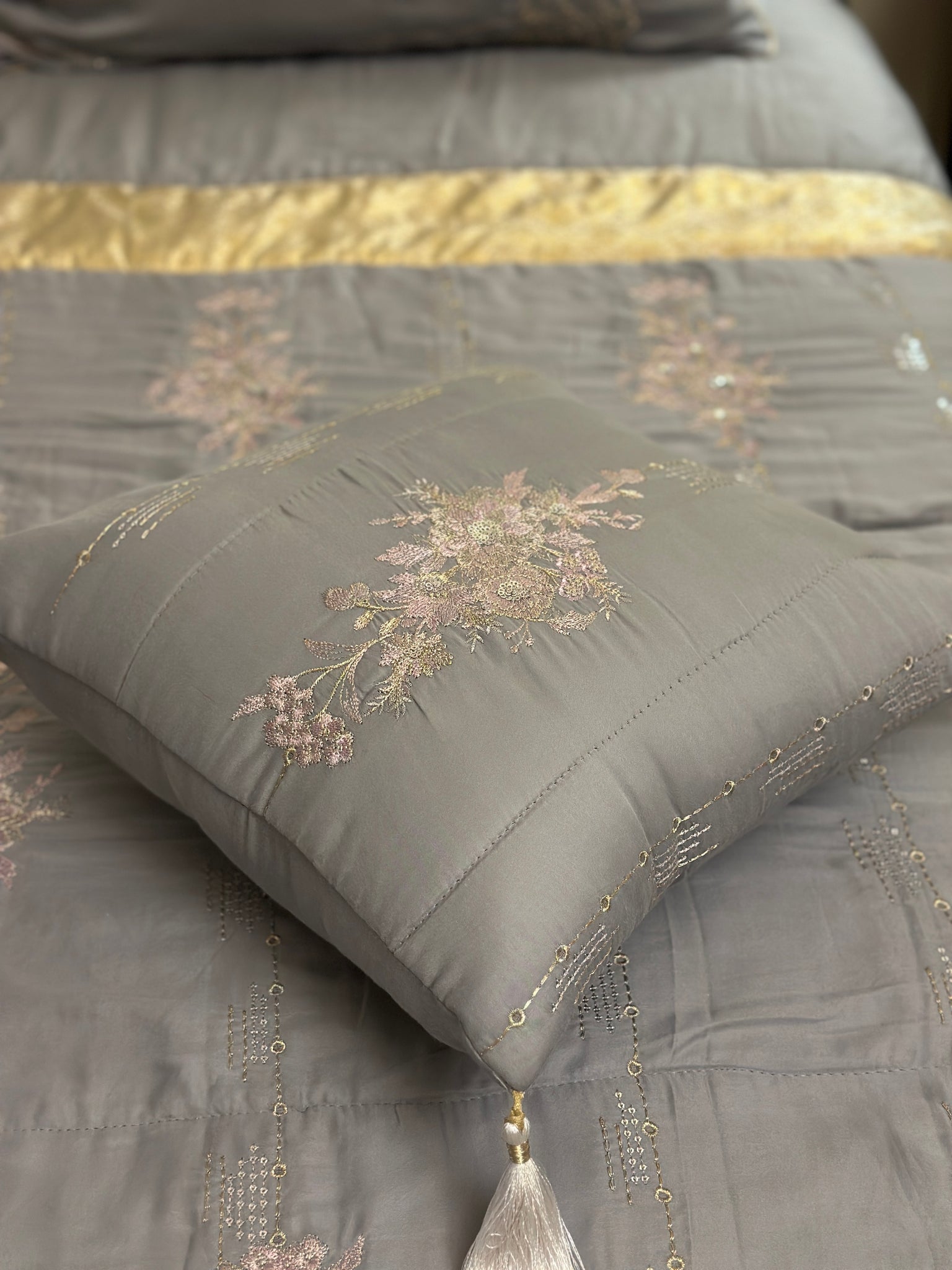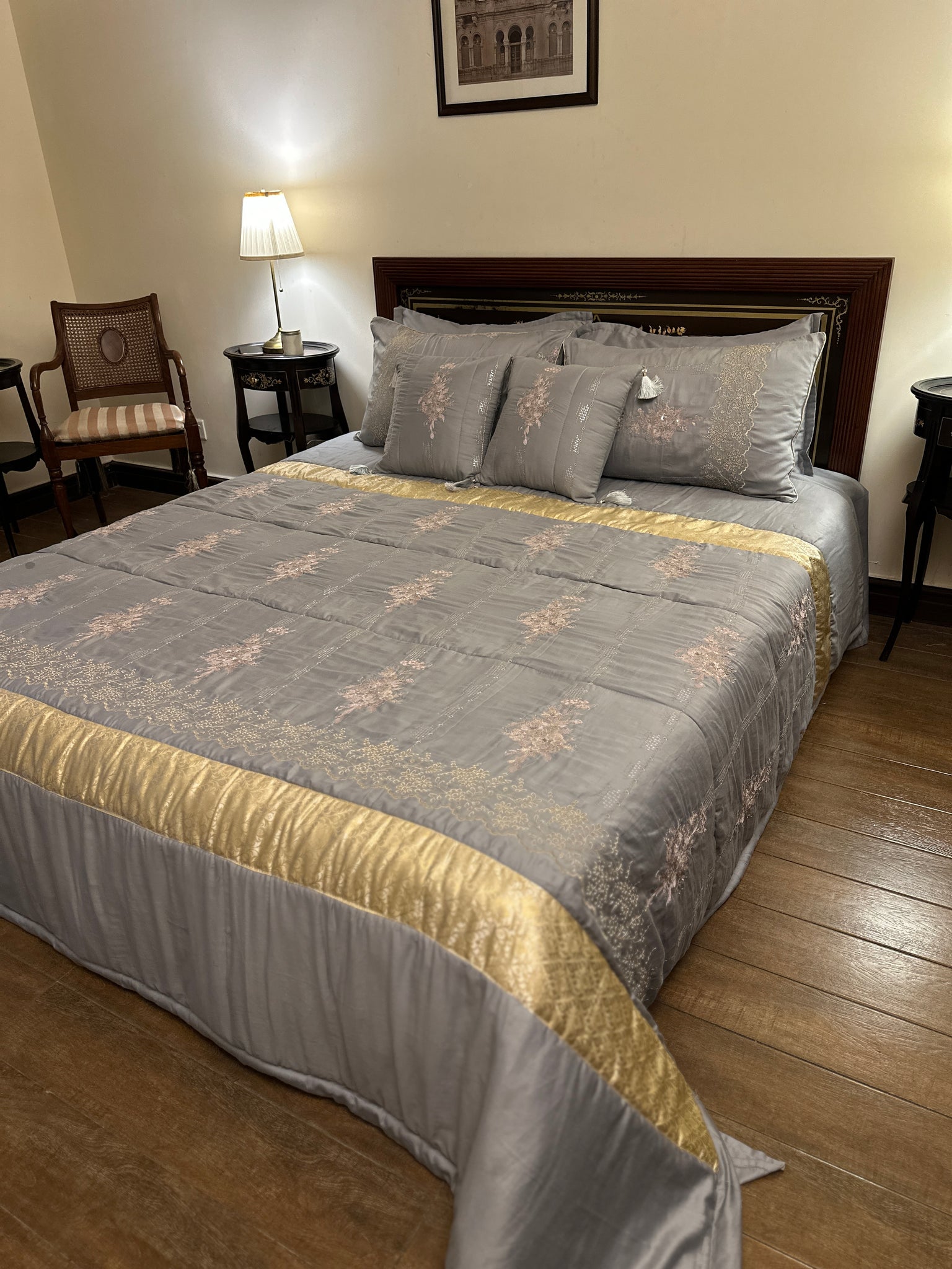 Modern yet steeped in tradition, Rang-e-Rakh presents a dignified grey base elevated with tilla and sequence embroidery work on premium cotton satin. This 8-piece bridal set is perfect for couples seeking something premium, neutral and timeless.